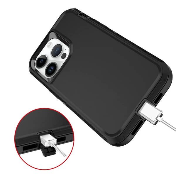 This Apple iPhone 14 Pro defender case with 4 shockproof corners bumper cushions offers your phone high grade drop protection. The dust proof plug design stops dust, dirt, and also lint from clogging your jacks and inputs.
