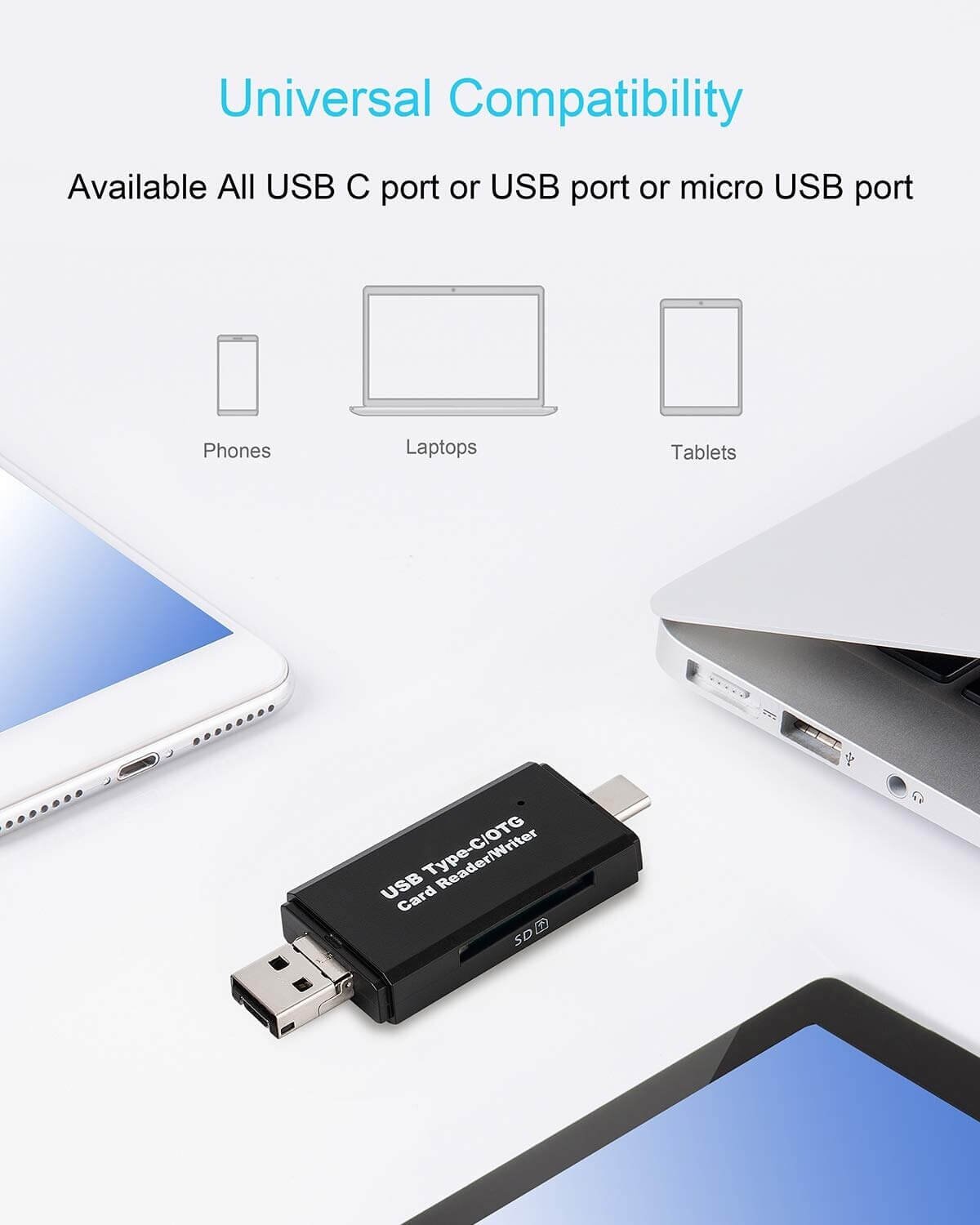 - 【Portable & Multi-Functional Design】USB Male & Micro USB Male & USB C (Type C) Male Connector, making this card reader compatible with Computer (PC or MacBook), Android S